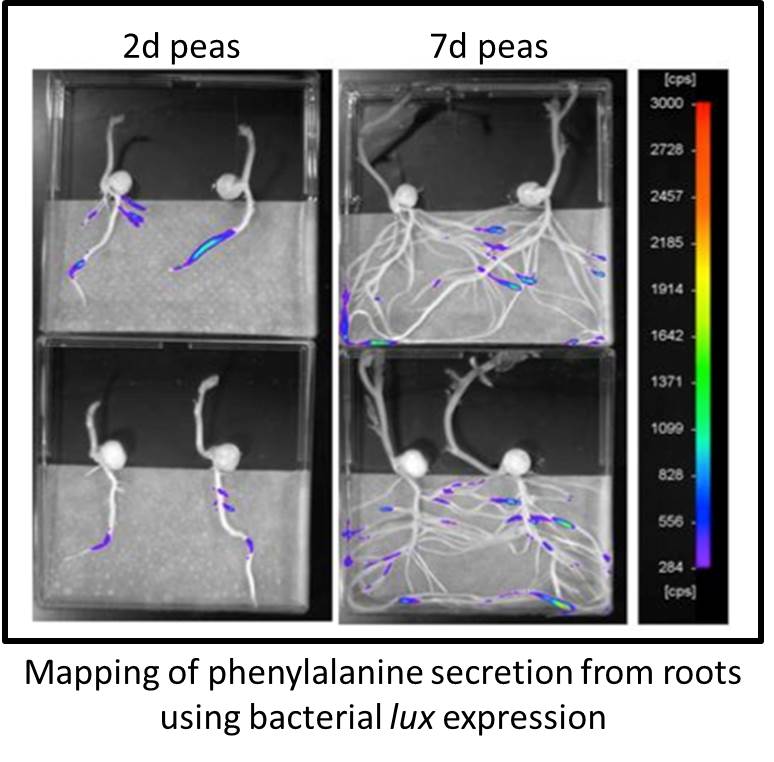 Bio-reporters based on Lux technology are particularly powerful because they enable non-invasive monitoring of plants, and we are able to map the release of metabolites to precise regions of roots (e.g. presence of phenylalanine on pea roots shown). Plants grown in square Petri dishes were inoculated with bacteria containing a specific biosensor to enable the precise temporal and spatial mapping of metabolites released by plants (2). It has also allowed us to begin screening plant mutants for both decreased and increased metabolite secretion.