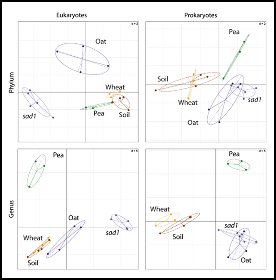 We are studying plant-microbe interactions in the rhizosphere using novel high-throughput sequencing (1). We are particularly interested in the microbial community changes due to the influence of different plants and the diagram below summarises these at the phylum and genus level in response to growth of pea, wheat, oat and an oat mutant (sad1) compared with unplanted soil.